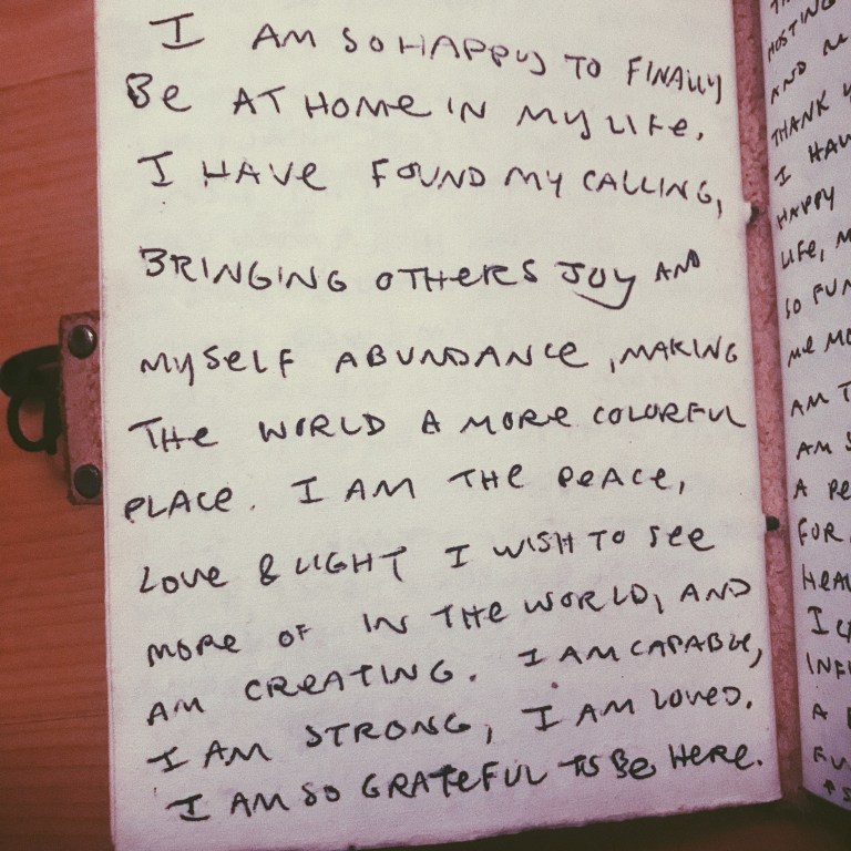 Some examples of what to write include: “Each day of my life brings a fun new adventure. I am thankful for my happiness, for my health, and for the abundance that flows consistently towards me. I am living in alignment with my soul’s highest purpose. I am appreciated for my talents. My career path is fulfilling and allows me to live freely. I travel frequently to explore the world’s beauty. I am full of love, and surrounded by love.”
